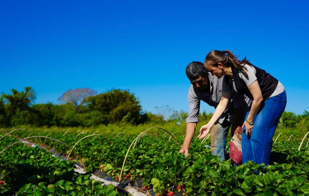 El productor local Faustino Rivas recibió a la vicegobernadora Silvana Schneider en su campo de Las Palmas, donde junto a su esposa llevan adelante un emprendimiento familiar de frutillas que ya cumple su cuarto año. Actualmente producen entre 40 y 45 kilos diarios que se comercializan dentro del pueblo.
