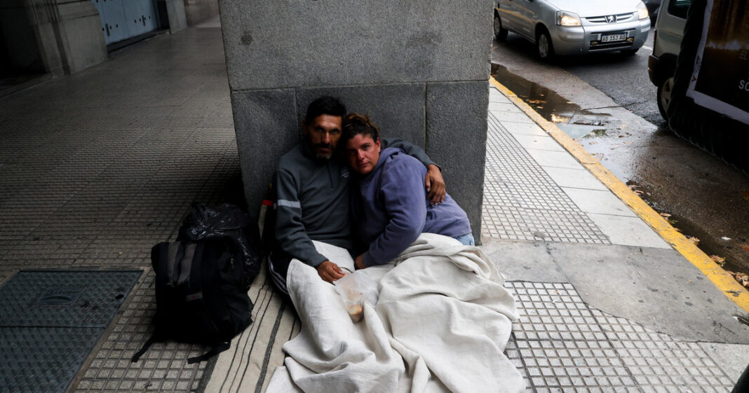 Abel Aníbal Arce (44) y Romina Yanina Surman (37) dicen que nunca, en nueve años juntos, se imaginaron abrazados debajo de una recova de avenida Paseo Colón. Pero ahí, a metros de la Casa Rosada, sentados en el piso y apoyados contra una columna, pasan una tarde de lluvia.